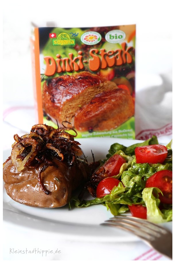 Das Dinkelsteak schmeckt auch sehr lecker nur mit Röstzwiebeln und Salat.