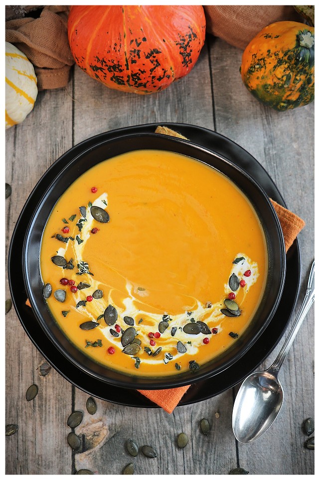 Zum Dekorieren könnt ihr nach Belieben vegane Sahne, geröstete Kürbiskerne, rosa Pfeffer oder fein geschnittene Petersilie verwenden. Anstelle der Sahne passt auch Kürbiskernöl richtig gut.