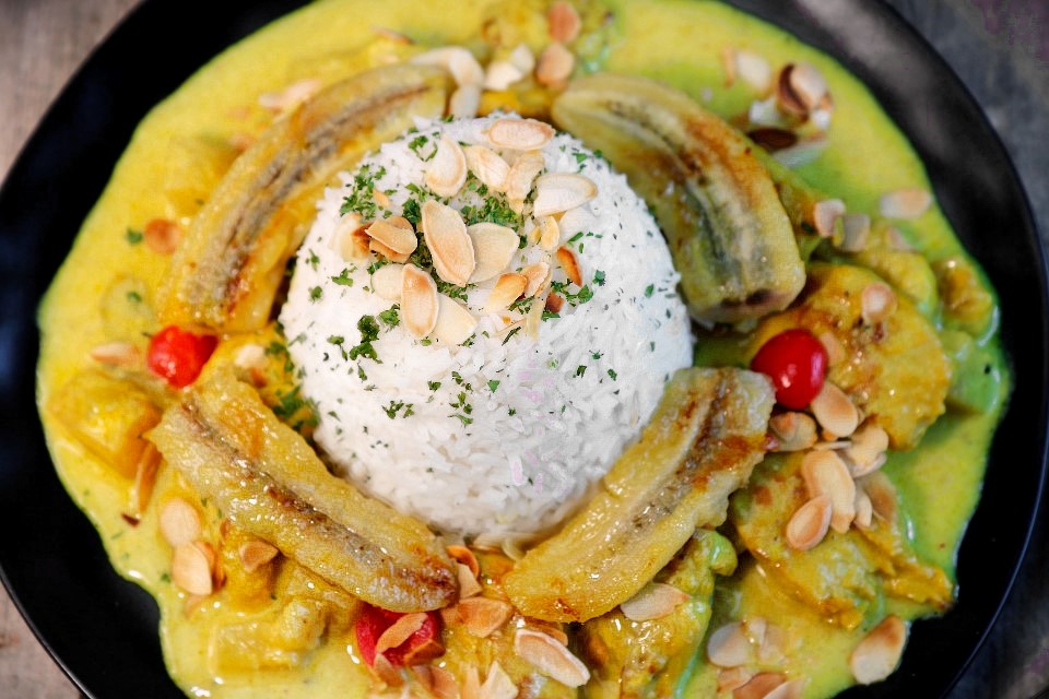 Gebt neutrales Pflanzenöl in eine Pfanne und bratet darin die Bananenscheiben und die Bananenviertel goldbraun von beiden Seiten. Nehmt sie aus der Pfanne und bratet in derselben Pfanne die Hähnchen-Alternative, bis die Stücke gut Farbe bekommen haben. Löscht mit der Brühe ab, nun kommen noch die Cocktailfrüchte dazu und die Bananen. Ca. 3 Minuten vorsichtig köcheln lassen. Danach den Saft zugeben, ganz kurz erhitzen. Dann den Herd fast ganz runterdrehen und die vegane Sahne dazugeben. Alles verrühren und ggf. noch abschmecken. Das Gericht wird nur noch erwärmt, es soll jetzt keinesfalls mehr kochen.